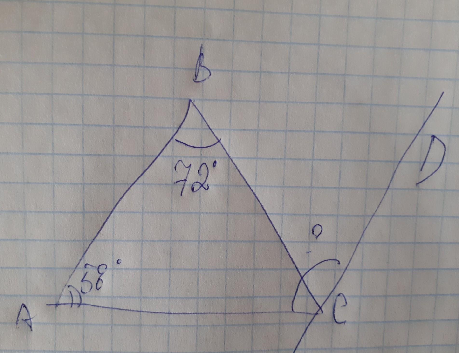 2.Дан треугольник АВС, через вершину С проведена прямая DC параллельно прямой BA. Найдите угол ACD, если угол BAC равен 58⁰, угол ABC - 72⁰.
