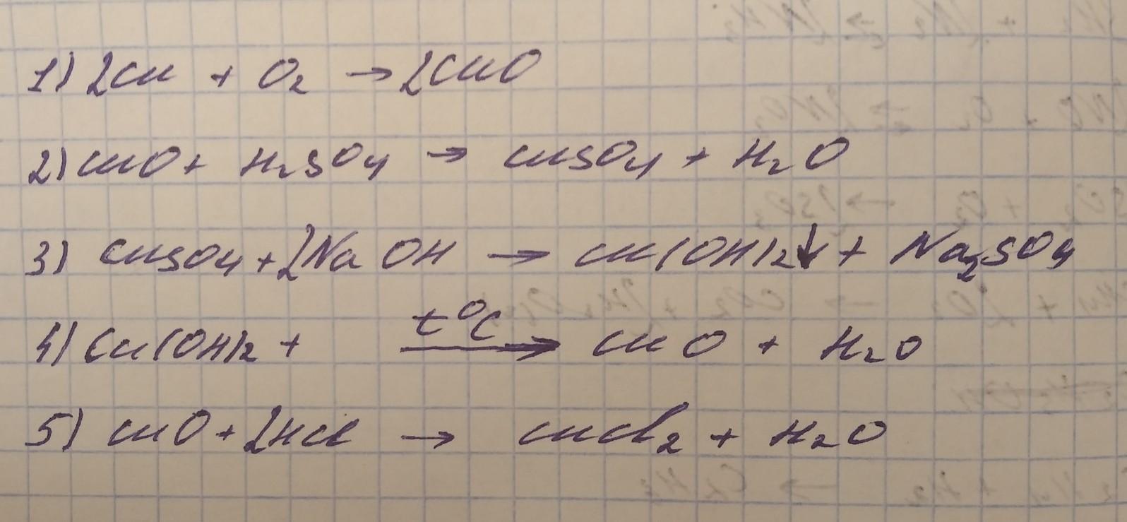 Решить цепочку превращений: медь → оксид меди (II) → сульфат меди (II) →гидроксид меди (II) → оксид меди (II) → хлорид меди (II).