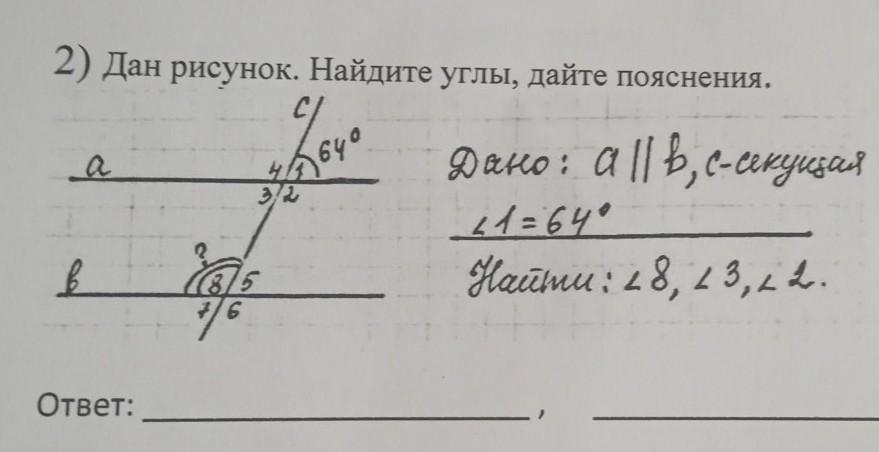 угол 3 и угол 8 внутренние односторонние, значит угол 3+угол 8= 180⁰, следовательно угол 8 равен 180⁰-64⁰=116⁰