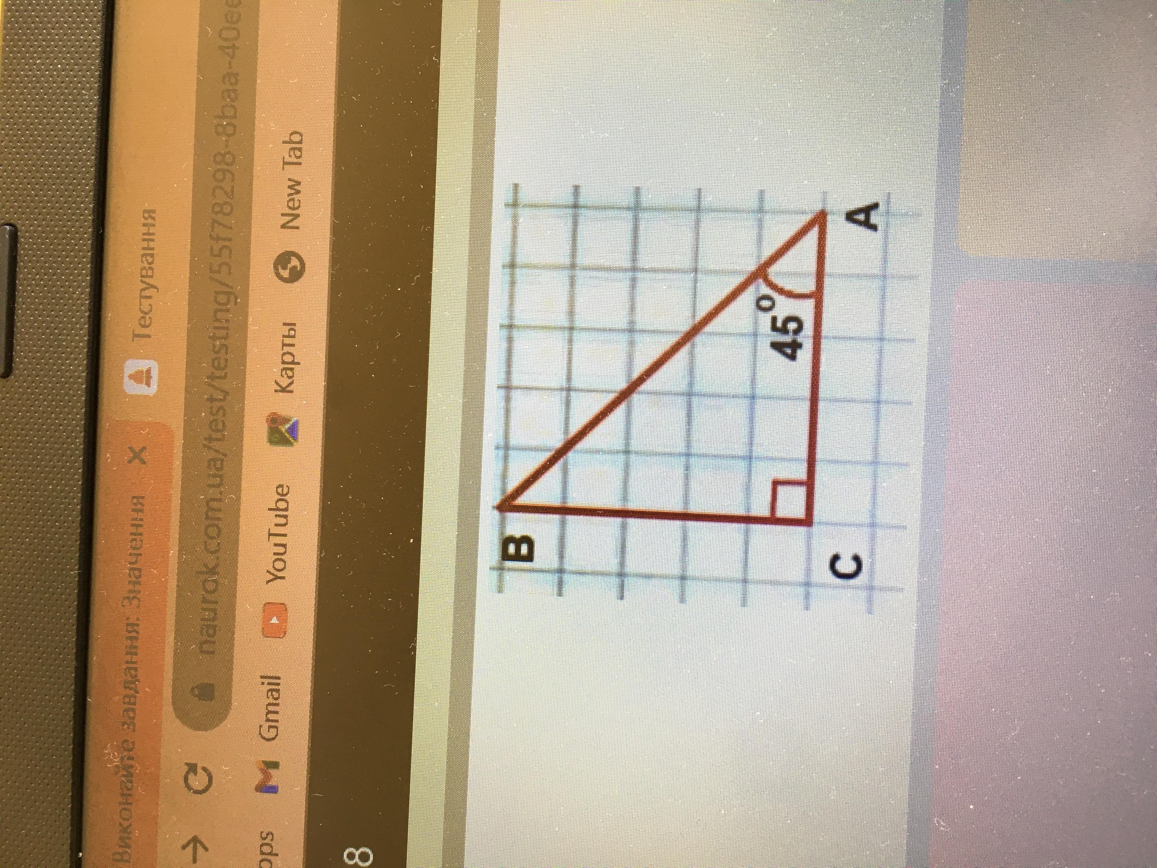 в прямокутному трикутнику АВС кут С=90, кутВ=45, АС=5см. Знайти гіпотенузу! Будьласка
