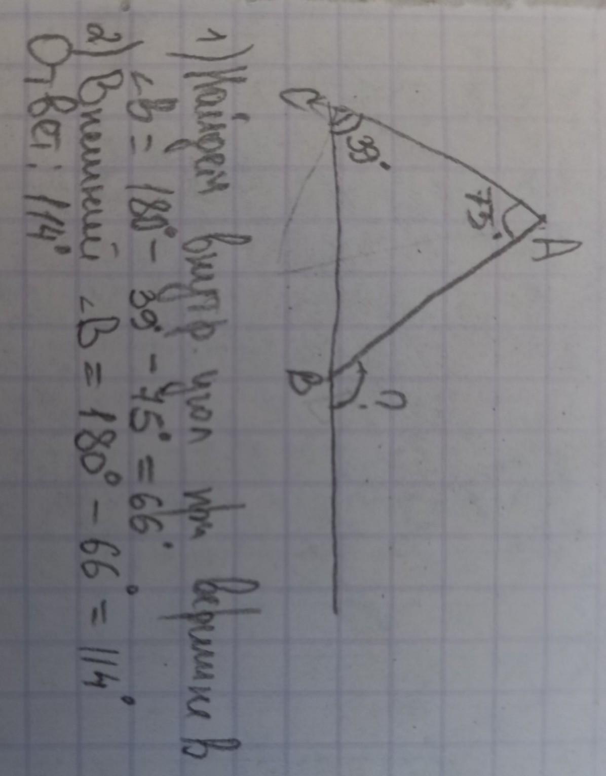 В треугольнике ABC внутренний угол при вершине А равен 75°, а внутренний при A вершине С равен 39°. Найдите внешний угол при вершине В.
