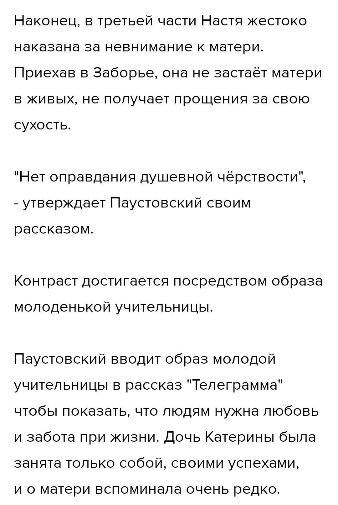 Оправдывает или осуждает Настю Паустовский? Как спомощью антитэзы писать помогает увилдет истинную доброту и человечность людей?как показано позднее прощение настив лининграде её состояние в Заборье какую роль играют описание природы этих сценах.