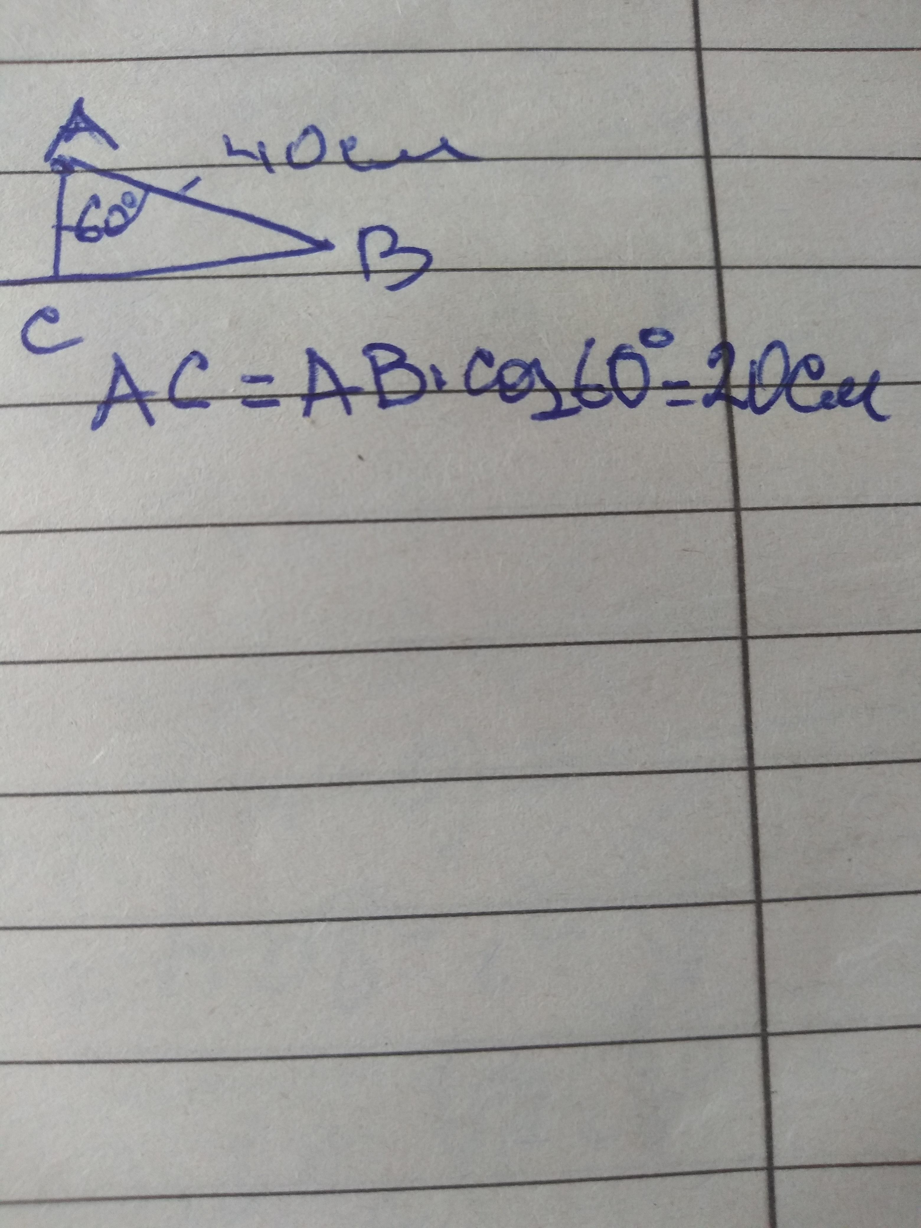 із точки А проведено до деякої прямої а перпендикуляр АС і похилу АВ. знайдіть довжину перпендикуляра, якщо похила АВ=40см, а кут між перпендикуляром і похилою - кутА=60! ПОМОЖИ!!!!