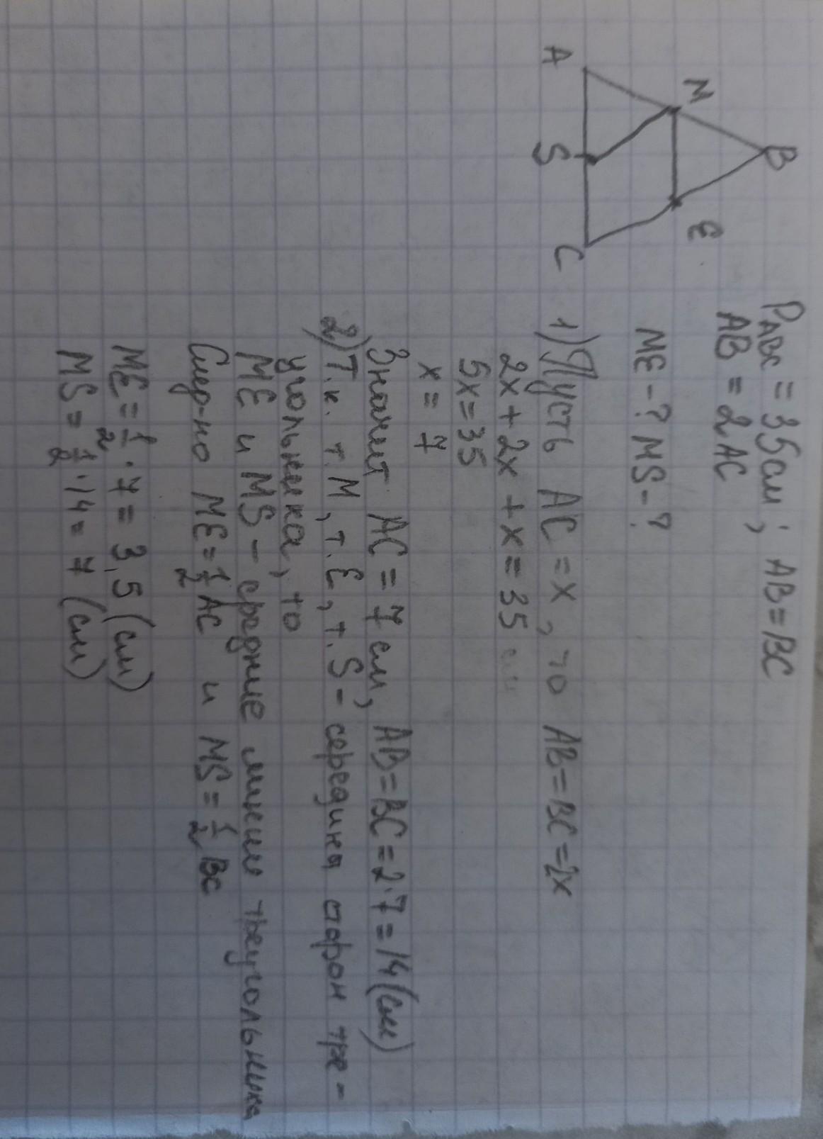 1. В равнобедренном треугольнике АВС с основанием АС отмечены точки М, Е и S – середины сторон АВ, ВС и АС соответственно. Периметр треугольника АВС равен 35 см, а боковая сторона в два раза больше основания.