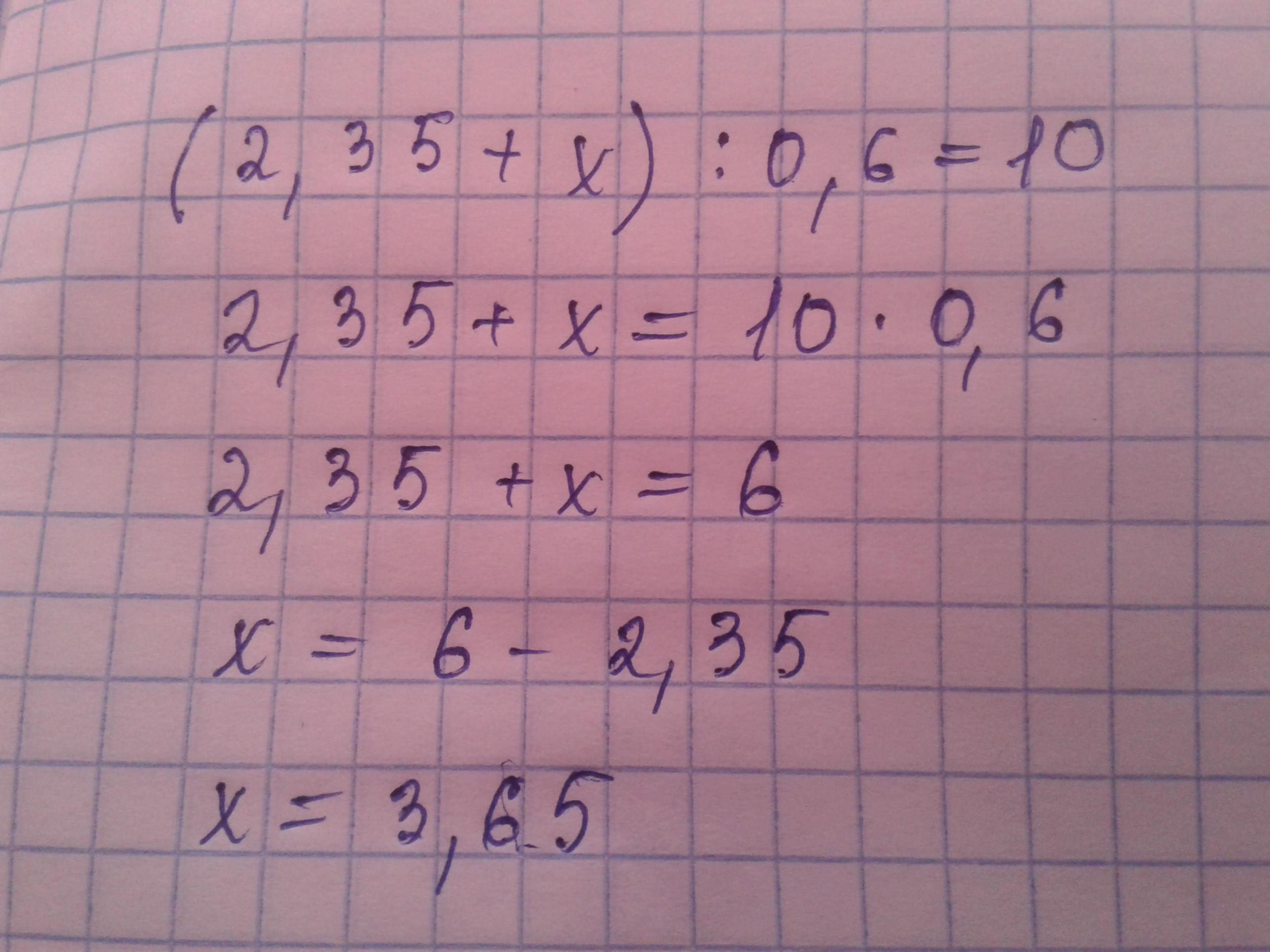 решите уравнение (2, 35 + x ) :0.6 = 10