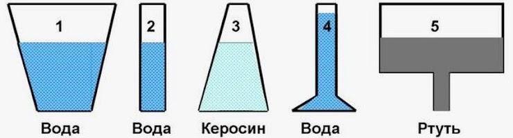 Давление зависит от высоты столба жидкости, от ускорения свободного падения и от плотности воды. 1, 2, 3, 5 имеют одинаковую высоту, но в 3 керосин, а плотность керосина меньше плотности воды. Плотность ртути намного больше плотности керосина