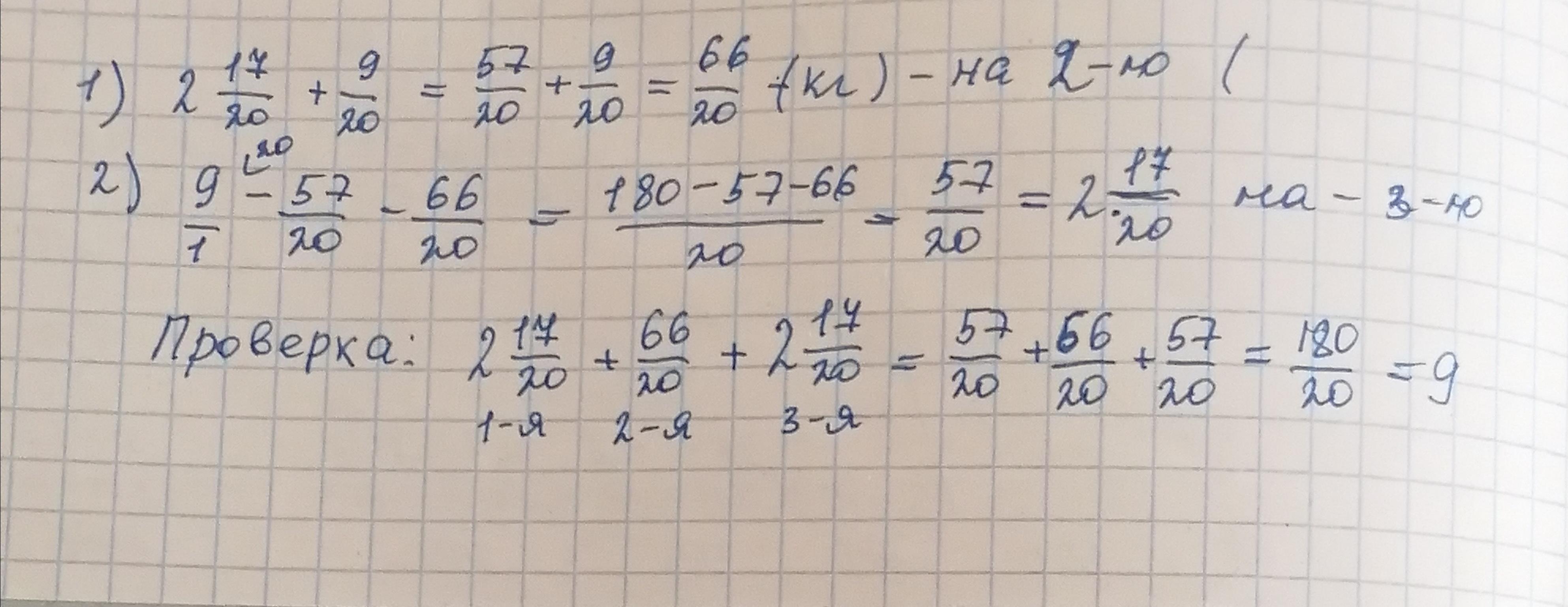 під час ремонт трьох кім нат витратили 9 кг сухого клею для шпалер. На першу кімеату витратили 2 17/20кг, а на другу на 9/20 більше ніж на першу. Скільки кг клею витратили на третю кімнату? Срочно на завтра