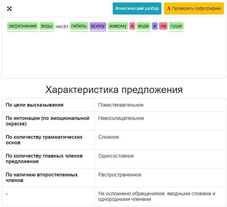 Синтаксический разбор предложения загрязнение воды несёт гибель всему живому в воде и на суше