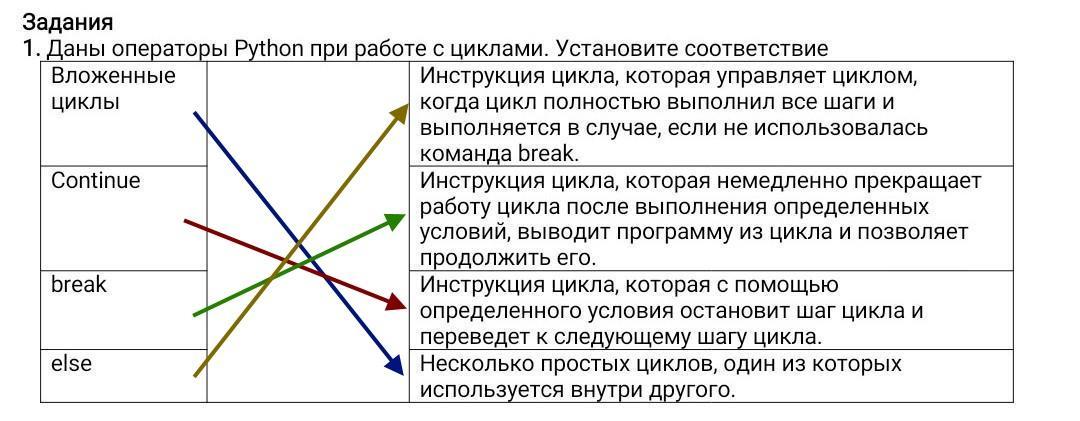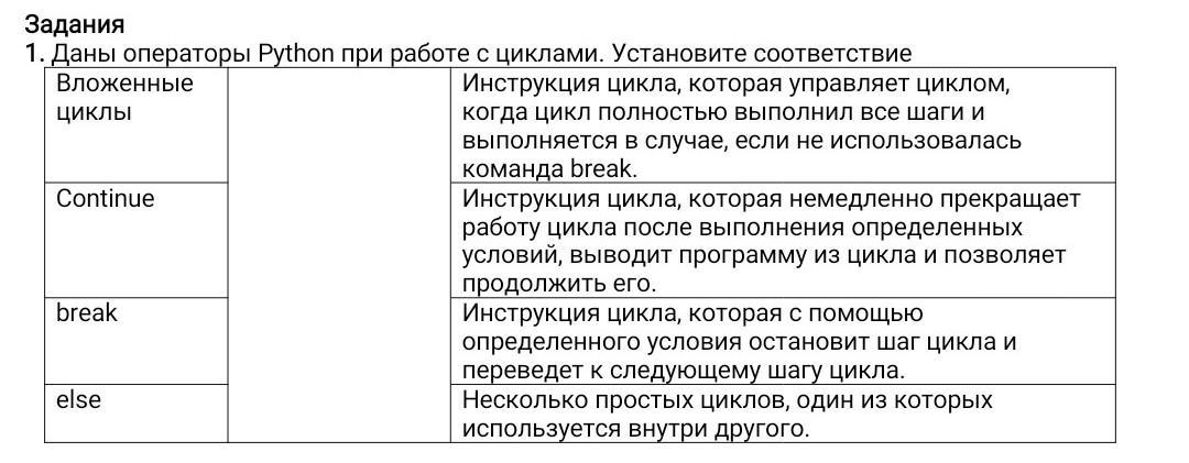 Даны операторы Python при работе с циклами. Установите соответствие Вложенные циклы Инструкция цикла, которая управляет циклом, когда цикл полностью выполнил все шаги и выполняется в случае, если не использовалась команда break. Continue Инструкция цикла, которая немедленно прекращает работу цикла после выполнения определенных условий, выводит программу из цикла и позволяет продолжить его. break Инструкция цикла, которая с помощью определенного условия остановит шаг цикла и переведет к следующему шагу цикла. else Несколько простых циклов, один из которых используется внутри другого.