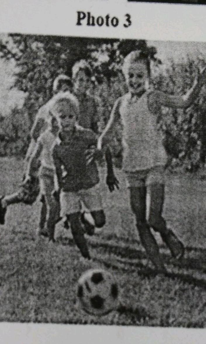 On this photo we can see kids playing football. The seem to really enjoy the game, because they are smiling. It looks like it is a summer time, as they are wearing very light clothes and it is really sunny out. It also looks like they just started the game, because they don’t look tired. The boy with the dark t-shirt seems to be really focused on the ball, I guess he really wants to get that ball before the girl. She will probably reach it first because she is much closer to the ball. Overall I really like the picture, because it reminds me of my summers holidays.