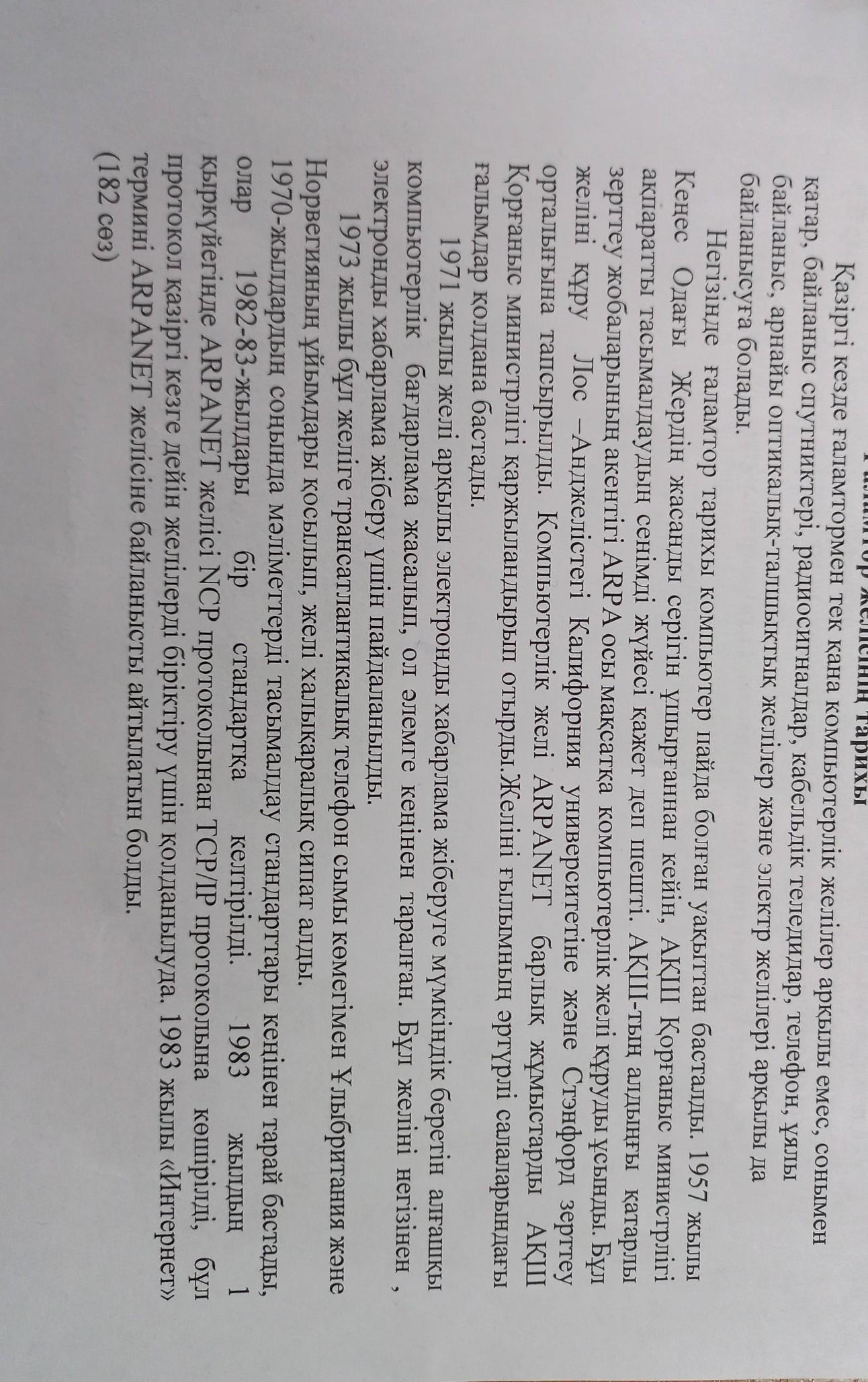 7-тапсырма. Берілген ақпараттарды ретімен қойыңыз (1 минут). Ақпарат Реті A) 1971 жылы желі арқылы электронды хабарлама жіберуге мүмкіндік беретін алғашқы компьютерлік бағдарлама жасалып, ол әлемге кеңінен таралған В) 1973 жылы бұл желіге трансатлантикалық телефон сымы көмегімен Ұлыбритания және Норвегияның ұйымдары қосылып, желі халықаралық сипат алды. C) 1957 жылы Кеңес Одағы Жердің жасанды серігін ұшырғаннан кейін, АҚШ Қорғаныс министрлігі ақпаратты тасымалдаудың сенімді жүйесі қажет деп шешті.