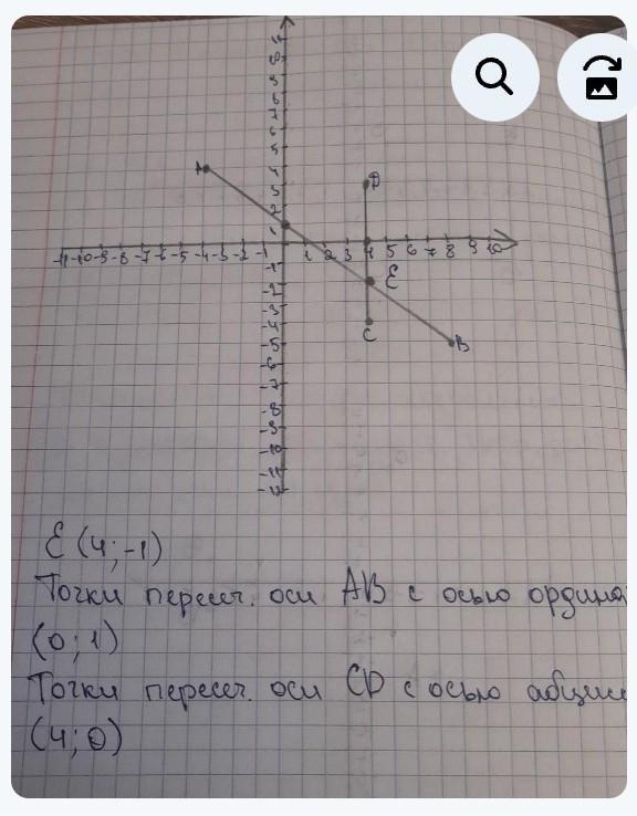 На координатной плоскости отметь точки A(–4; 4), B(8; –5). 2) На координатной плоскости отметь точки C(4; –4) и D(4; 3). 3) Найди координаты точки пересечения прямых AB и CD. 4) Найди координаты точки пересечения прямой AB с осью ординат. 5) Найди координаты точки пересечения прямой CD с осью абсцисс.