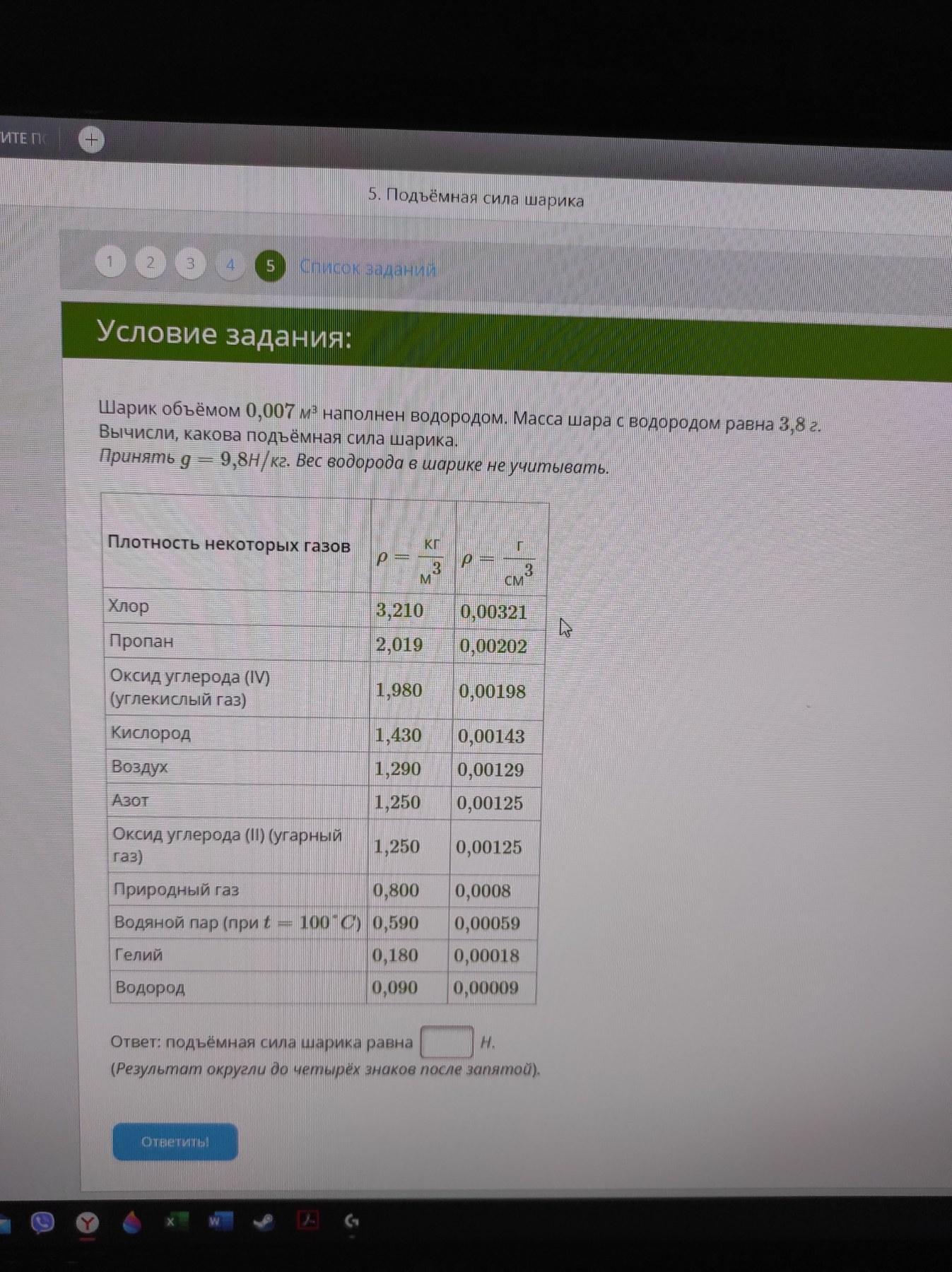 Fпод=(ρ1-ρ2)*g*V-Р=(ρ1-ρ2)*g*V-mg=(1,29-0,09)*9,8*0,007-0,0038*9,8=0,0045Н