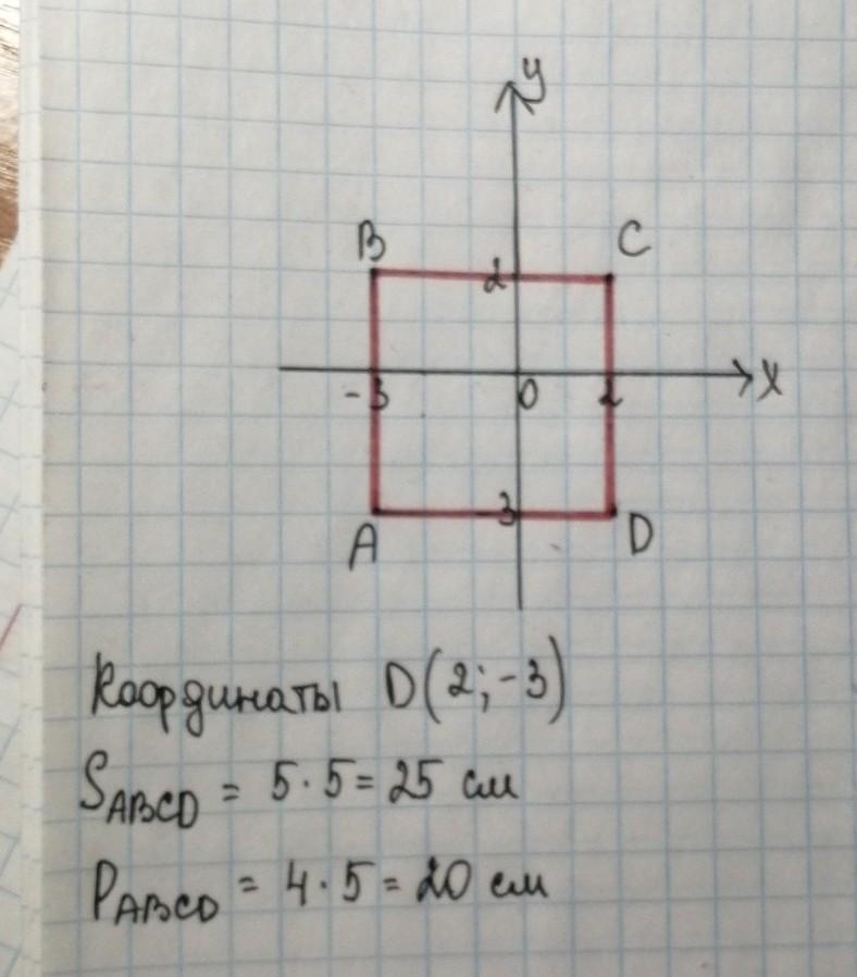 2.Постройте квадрат ABCD, если A(-3; -3), B(-3; 2) и (2; 2). Найдите коор