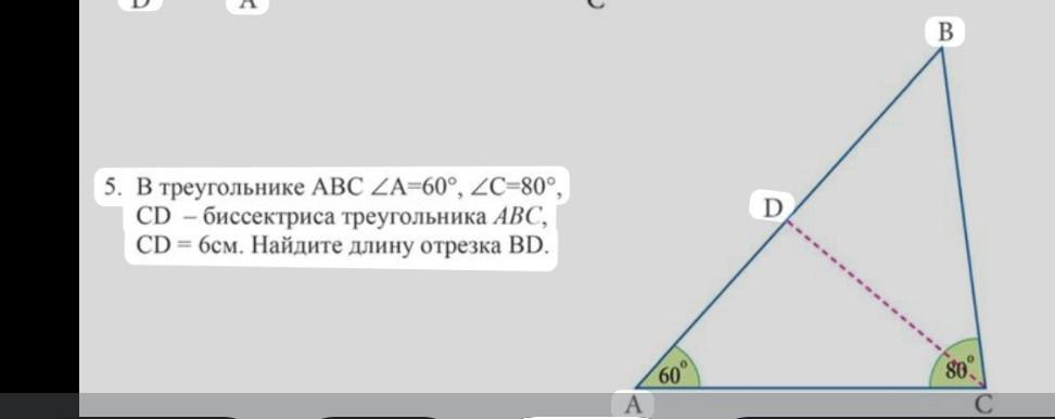 В треугольнике ABC ZA-60º, <C-80° CD -биссектриса треугольника ABC CD-бем. Найдите длину отрезка BD.