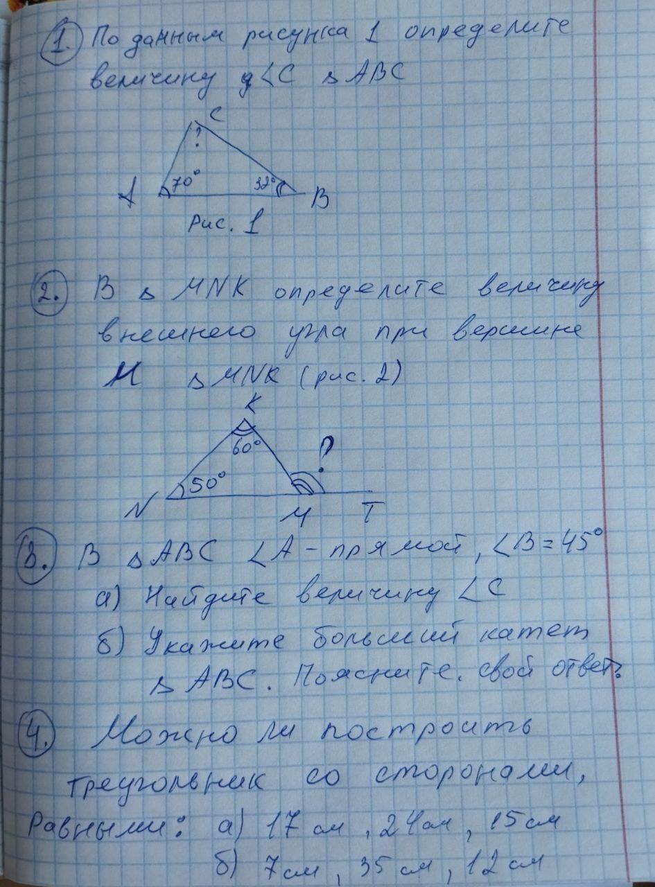 1)сумма всех углов треугольника равна 180° => угол С = 180-70-32=78°