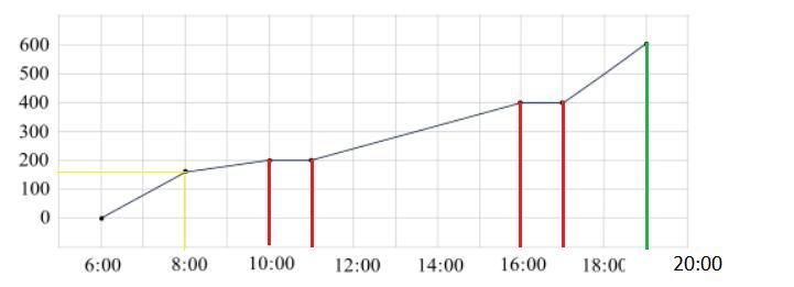 На рисунке представлен график автомобилиста из Кахамарки в Уарас (Перу), расстояние между которыми можно принять за 600км. На горизонтальной оси отложено время, а на вертикальной оси - расстояние от Кахамарки в километрах. Для вашего удобства график представлен в ломанной линии. Проанализировав график, опишите поезду (оцените наличие или отсутствие дорожных происшествий, остановок, пробок и платных дорог). Какова средняя скорость движения автомобилиста на всём маршруте? На платных дорогах скорость значительно выше.