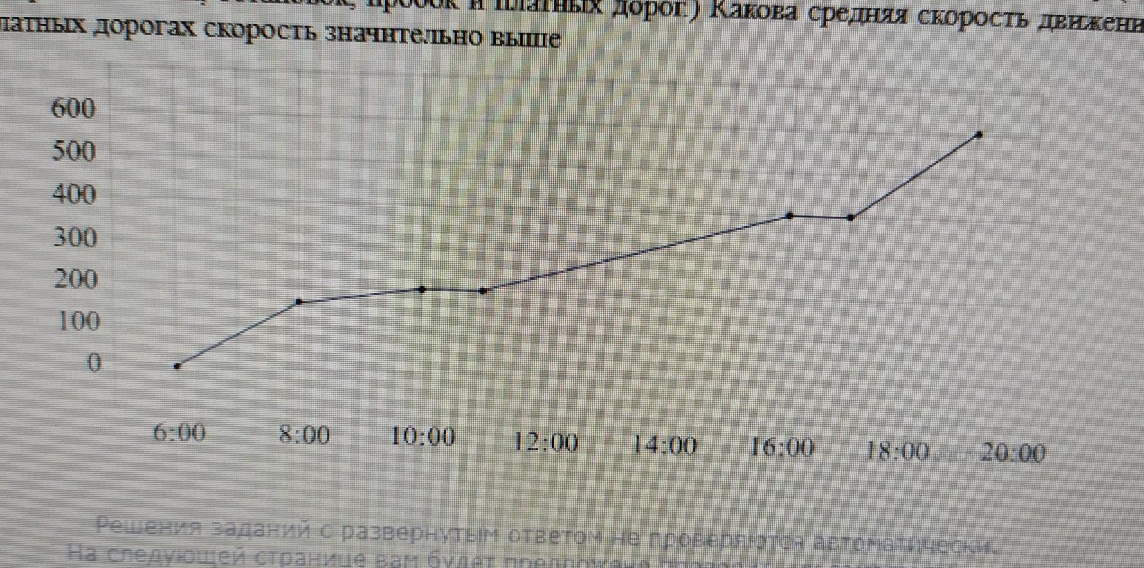 Проанализировав график, опишите поездку (оцените наличие или отсутствие дорожных происшествий, остановок, пробок и платных дорог). Какова средняя скорость движения автомобилиста на всём маршруте?