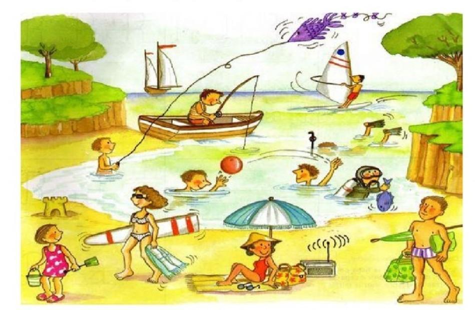 Ответ: 1-the girl is siting 2-the boy walks 3-the small girl play with the sand 3-boys are playing voleyball in the sea 4-the man is sailing 5-other man is fishing 6-small boy found some fish 7-girl goes to surf 8-the umbrella is beautiful 9-the trees are big 10-the man is tall 11-there is a sandcastle 12-there is a red ball 13-there is a purple fish 14-the purple fish is big 15-there are three boats 16-the girl is happy 17-there have got sun glasses 18-everyone likes to go to the bitch 19-the boy is snorkelling