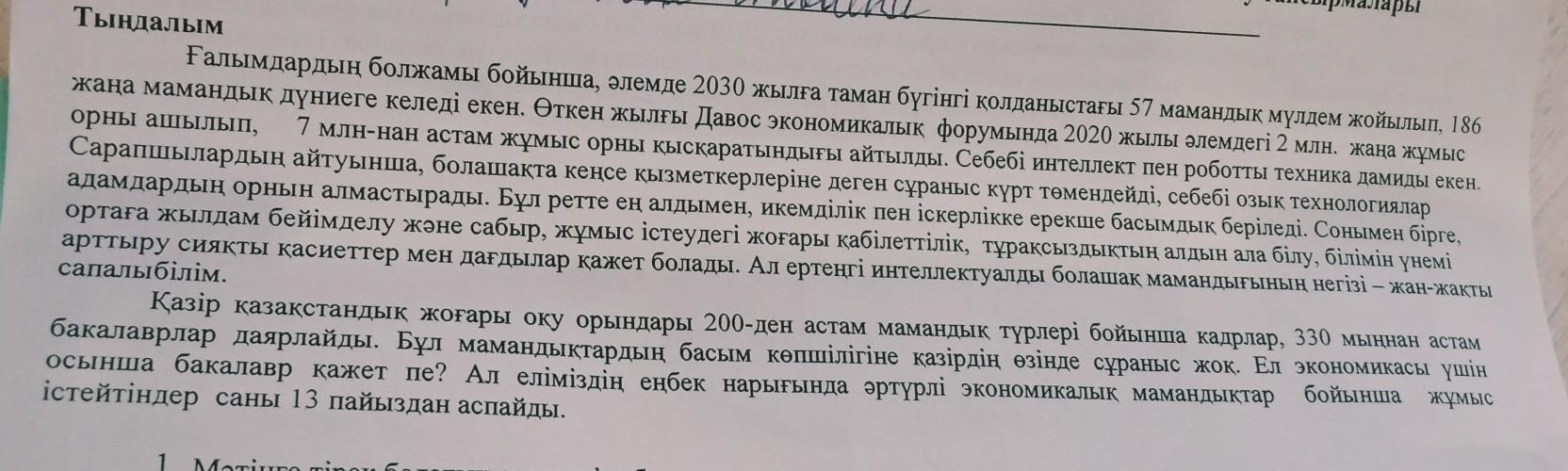 1. Мәтінге тірек болатын сөздерді табыңыз . А ) ЖОО , мамандык , болашак В ) Жұмысбастылык , енбек , бiлiм С ) Адамдар , бiлiм , студент Д ) Зерттеу , адамдар , куш 2. Мотiннiн негiзгi идеясына сәйкес келетін тұжырымды аныктаныз . А ) Мамандык турлерi туралы В ) ЖОО туралы статистика C ) Студенттердi окыту Д ) Болашак мамандыктар турал