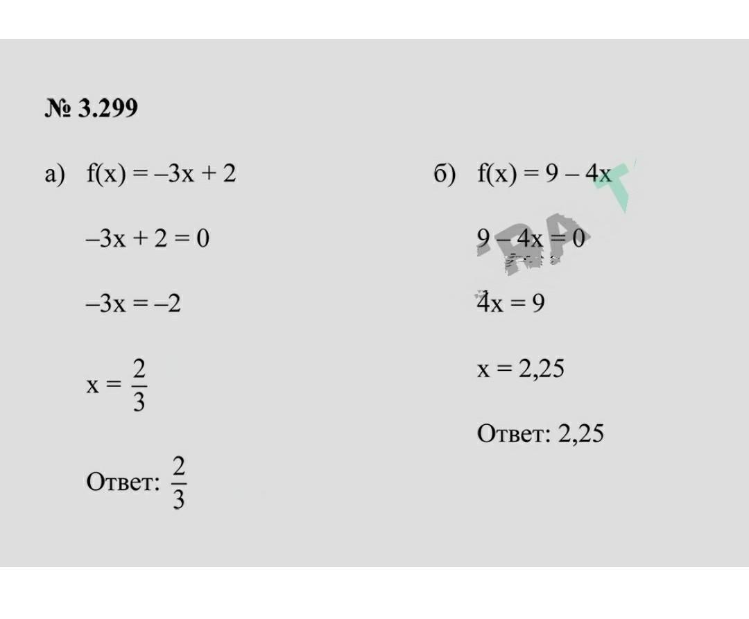 3.299. Найдите нули функции, заданной форму- лой: а) f(x) = -3х + 2; б) f(x) = 9 – 4х.
