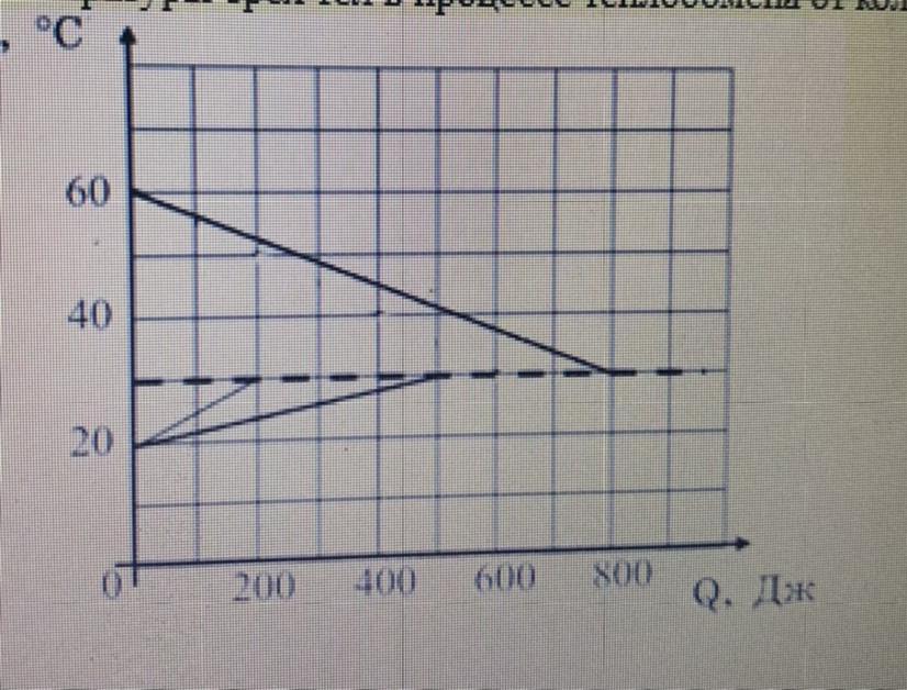 нагретый до температуры 60°С металлический брусок опускают в алюминиевый калориметр с водой при температуре 20°С. Масса калориметра равна массе воды в нём. На рисунке представлена зависимость температуры трёх тел в процессе теплообмена от количества теплоты, полученного или отданного в ходе теплообмена. Удельная теплоемкость воды 4200Дж/кг•°С, удельная теплоемкость алюминия 920Дж/кг•°С.