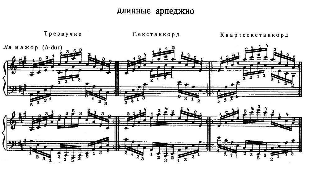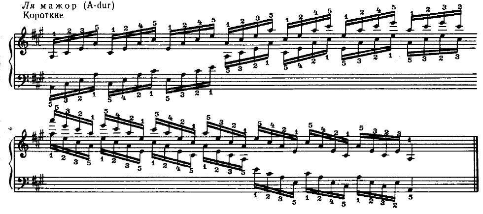 Короткие и длинные арпеджио с аппликатурой в ля мажоре.