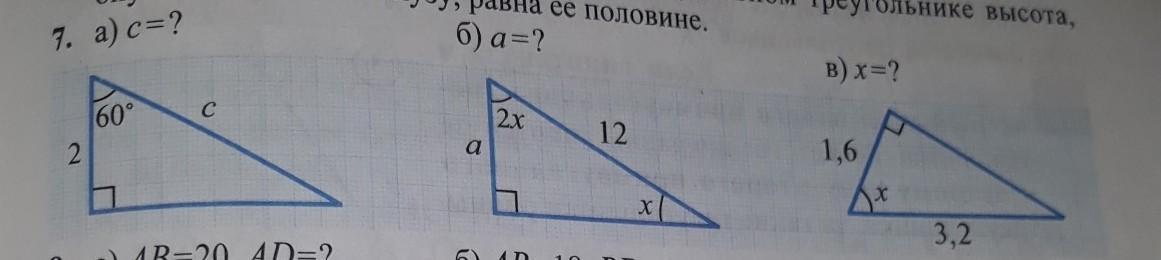 в)так как катет равен половине гипотенузы, то угол против него равен 30 градусам, но, так как х другой угол, то он равен 90-30=60 градусов