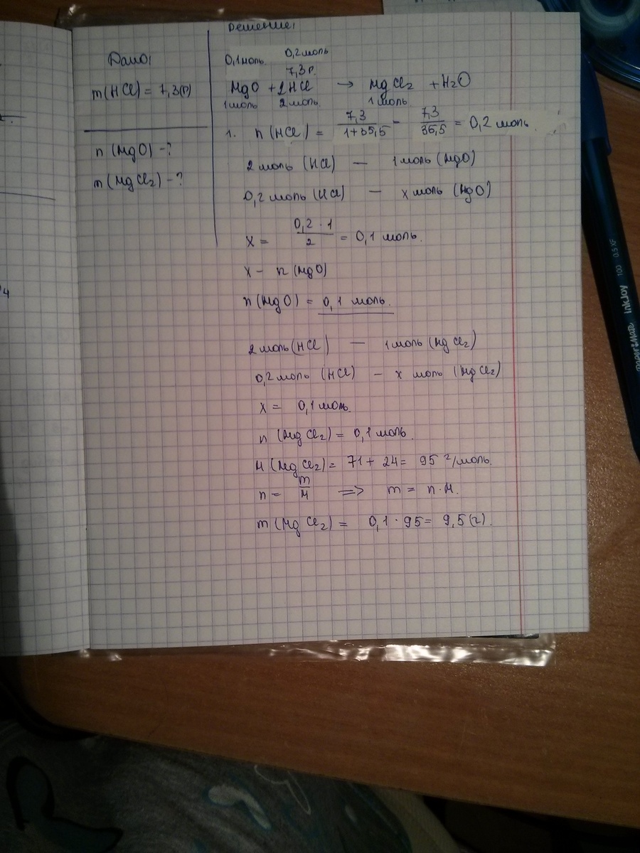 Помогите пожалуйста.Какое количество вещества оксида магния прореагирует с 7,3г соляной кислоты?Определите массу образующегося хлорида магния.(Заранее спасибо)