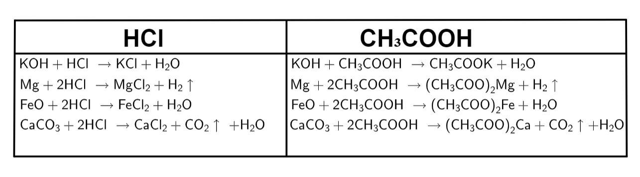 . Порівняйте хімічні властивості неорганічних і карбонових кислот. Для цього в одному стовпчику складіть рівняння реакцій хлоридної кислоти, а в другому стовпчику — етанової кислоти з: KOH, Mg, FeO, CaCO3.