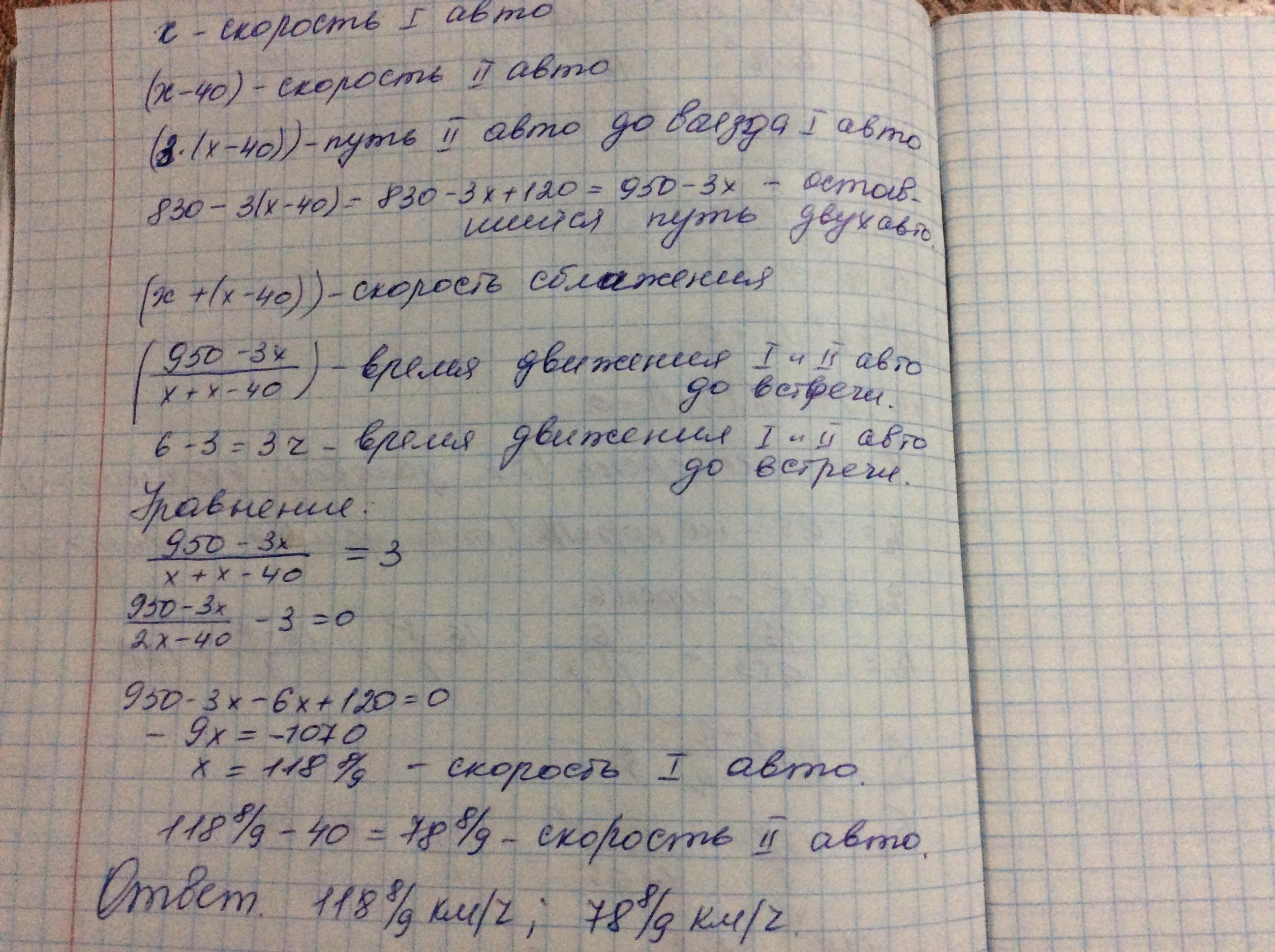 Полное решение .Из двух населённых пунктов расстояние между которыми 830 км навстречу друг другу выехали два автомобиля причём скорость первого автомобиля на 40 км больше скорости второго автомобиля известно что 2 автомобиль выехал на 3 часа раньше первого автомобиля и они встретились через 6 часов после выезда второго автомобиля Найдите скорость этих автомобилей