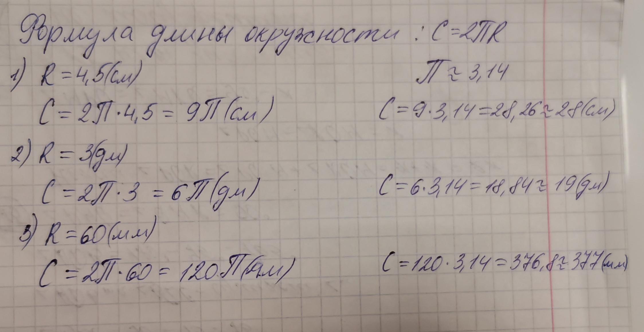 1. Вычислите длину окружности, если её радиус равен: 1) 4,5 см; 2) 3 дм; 3) 60 мм.