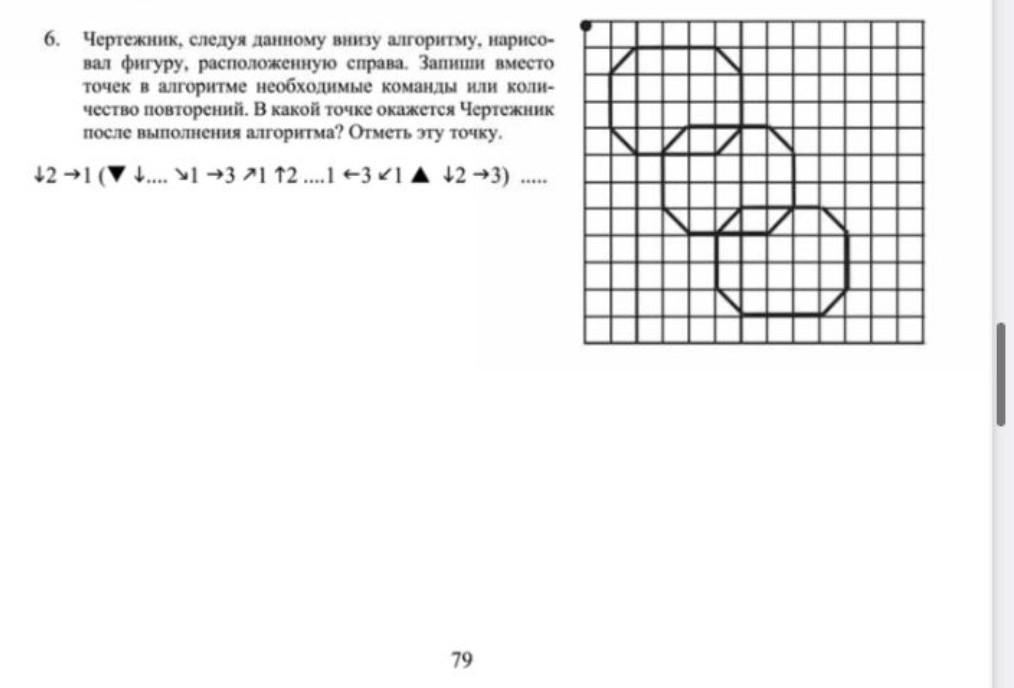 чертежник следуя данному внизу алгоритму нарисовал фигуру расположенную справа запиши вместо точек в алгоритме необходимые команды или количество повторений в какой точке окажется чертежник после выполнения алгоритма отметь эту точку