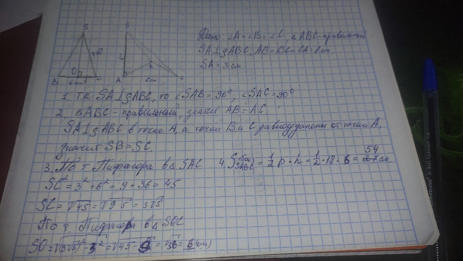 В основании треугольной пирамиды SABC лежит правильный треугольник ABC. Боковое ребро SA перпендикулярно плоскости основания. Длина ребра основания равна 6 см, а ребро SA 3 см.