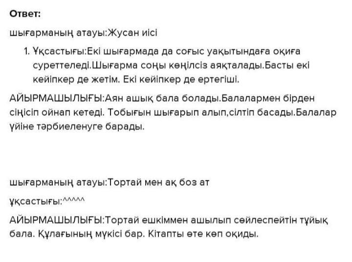 11. «Жусан иiсi» мен «> энгiмесiн салыстырыныздар. Аян мен Тортайдын тагдырларынын ауыр болуына кандай жагдай себеп болды?Екі бала неліктен армандарына жете алмады деп ойлайсыз? Энгiмеден дәлел келтіре отырып, әдеби эссе