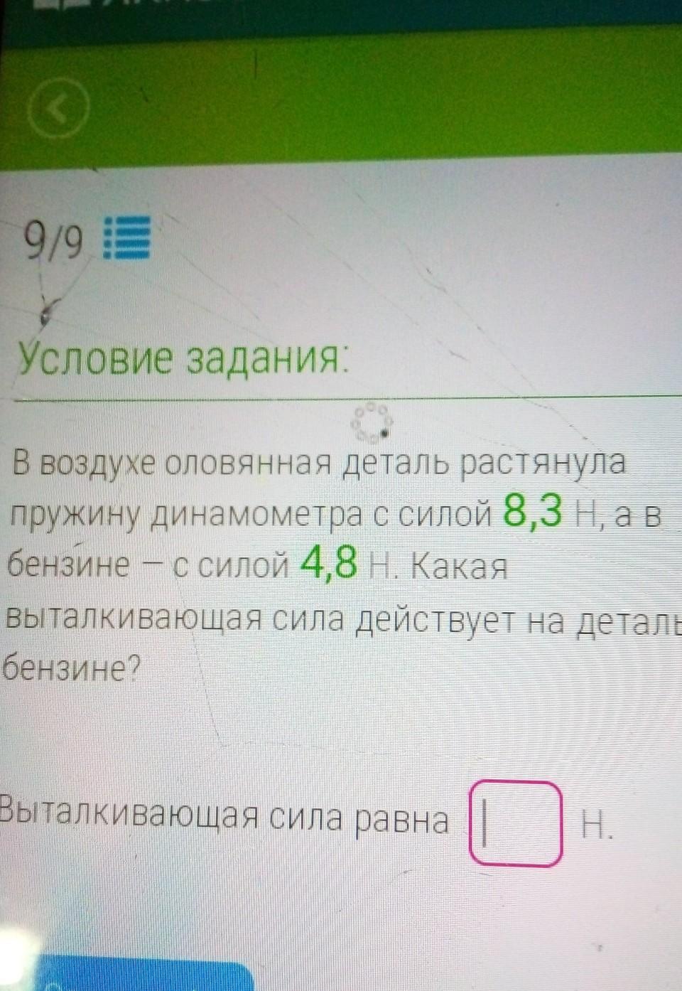 воздухе Оловянная деталь растянула пружину динамометра с силой 8000 н а в бензине с силой 4,8 Какая выталкивающая сила действует на деталь в бензине выталкивает сила равна. ПОМОГИТЕ, ПЛИЗ❗❗❗