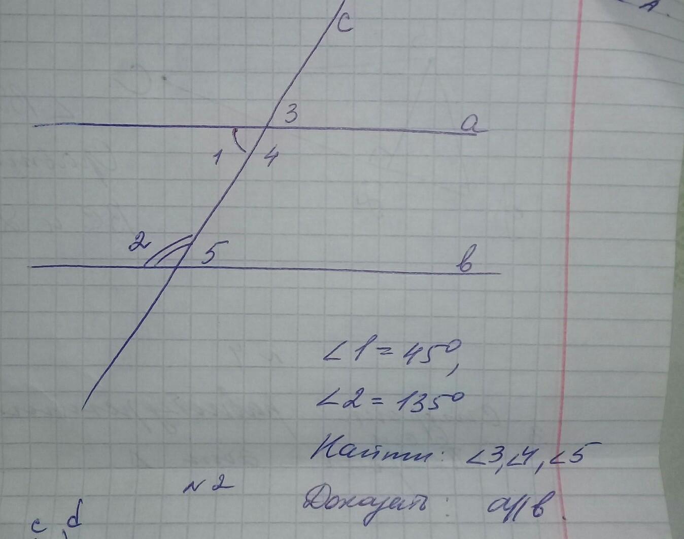 Ответ:3=45(вертикальные с углом 1); 4=135(накрест лежащие с углом 2); 5=45(накрест лежащие с углом 1)