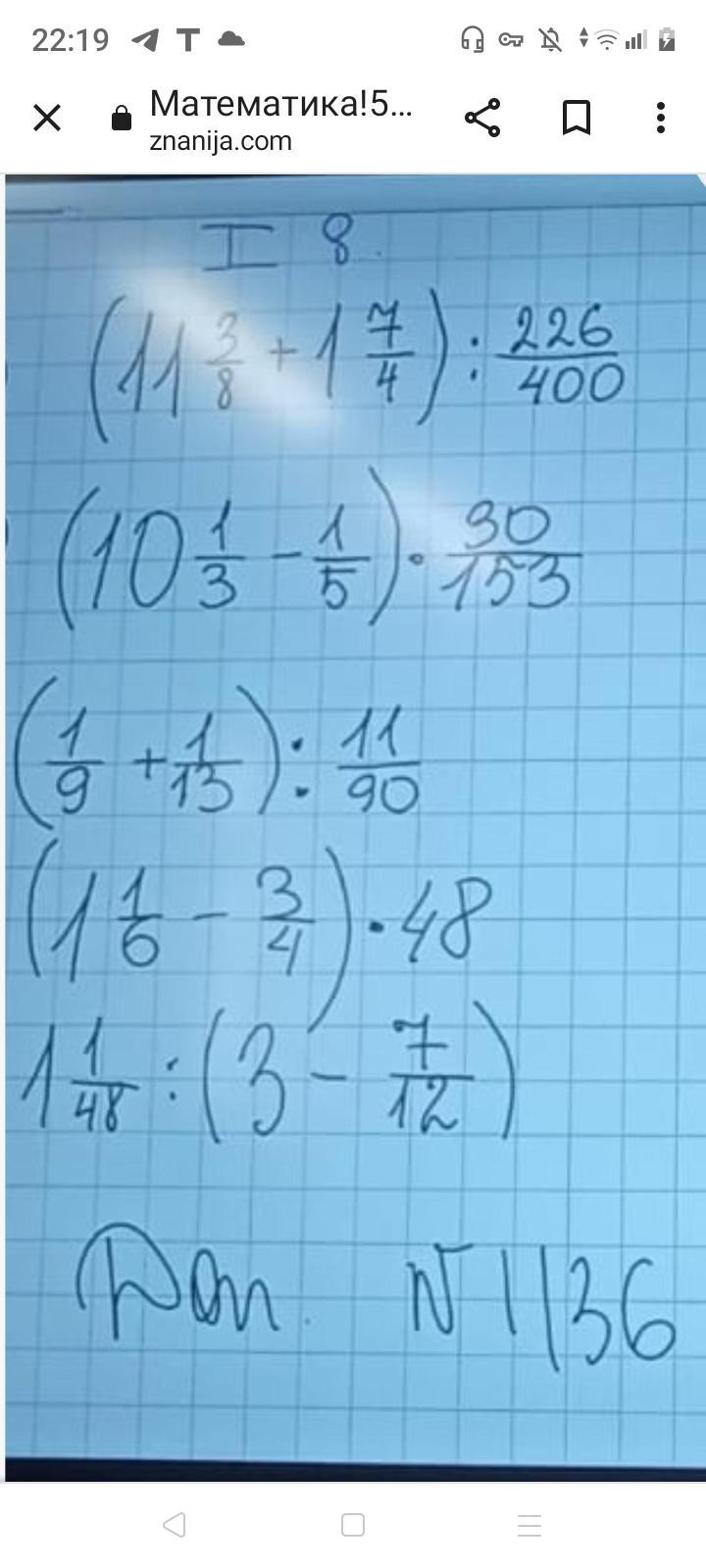 для начала складываем сложение в столбике, что-бы их сложить нужно подобрать наименьший знаменатель что-бы делился на оба числа. Я взял число 8 так как оно делится на 4 и на 8. Потом делишь знаменатель который ты подобрал на изначальные знаменатели числа которые получились после деления приписываешь к числителю эти числа называются дополнительными множителями. Потом умножаешь числитель на дополнительный множитель.(я написал сразу ответ который получался в скобках, если учитель требует подробно то делай подробно если требует кратко то делай кратко) (кратко это так как у меня) потом складываешь числа которые получились: числитель на числитель знаменатель на знаменатель. дальше идёт деление:что-бы поделить любое число на дробь нужно, на перевёрнутую дровь. я разделил и сократил(я просто не знаю как объяснить как сокращать думаю ты это и сам знаешь).(я написал лишь 1 пример что-бы ты понял как это делать)