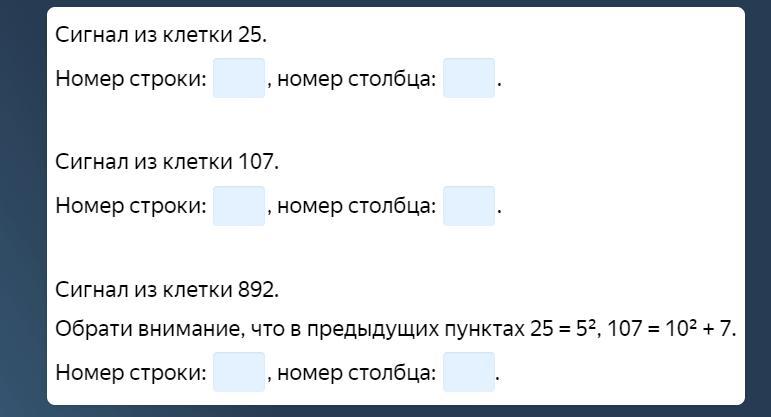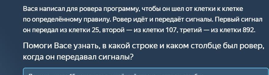 Вася написал для ровера программу, чтобы он шел от клетки к клетке по определённому правилу. Ровер идёт и передаёт сигналы. Первый сигнал он передал из клетки 25, второй — из клетки 107, третий — из клетки 892.