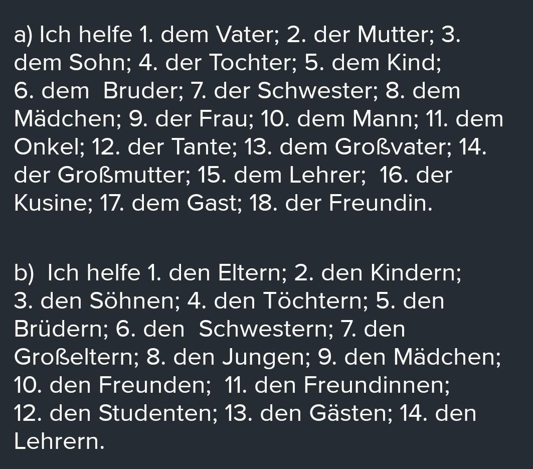 Koch, kein Dolmetscher) zu. 3. Otto gratuliert (dieses Kind, die Frau, mein Sohn, die Tochter, die Großeltern, die Familie, alle). 4. Der Fisch schmeckt Idas Mädchen, meine Geschwister, kein Kind, der Rentner, diese Studenten, der Gast) gut. 5. Das Haus gefällt (der Bäcker, meine Oma, die Tante, dieser Informatiker, die Leute, der Onkel 6. Ich glaube (der Geschäftsmann, diese Geschäftsfrau, die Geschäftsleute, der Chef, diese Praktikantin, der Kellner) 7. Das Geld gehört (die Frisörin, dieser Ingenieur, der Elektriker, der Mann, diese Verkäuferin, die Journalisten). 8. Wie geht es (die Oma, die Tante, deine Eltern, das Kind, deine Frau, dein Mann)?