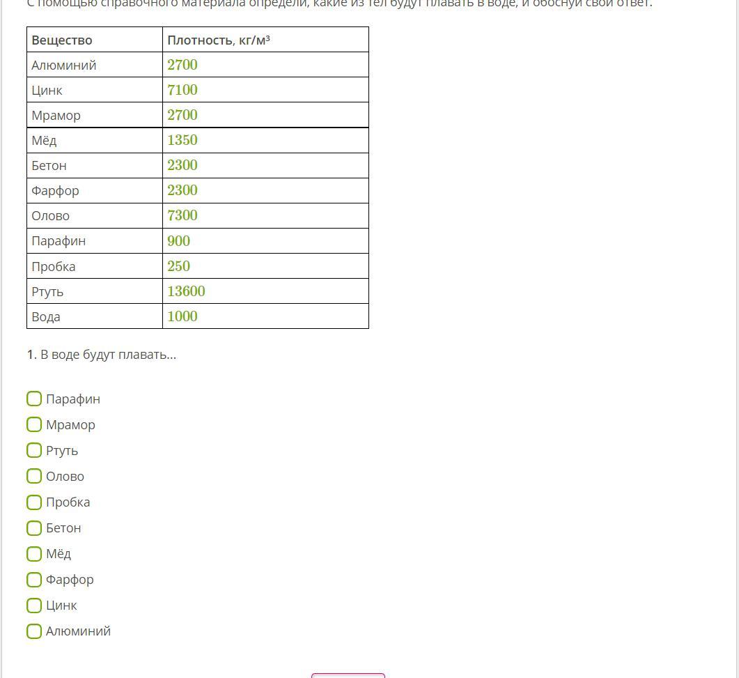 С помощью справочного материала определи, какие из тел будут плавать в воде.