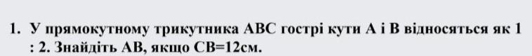 У прямокутному ТРИКУТНИКА ВАС гострі кути АіВ відносяться як 1:2.ЗнайдітьАВ,ЯКЩО СВ=12см.