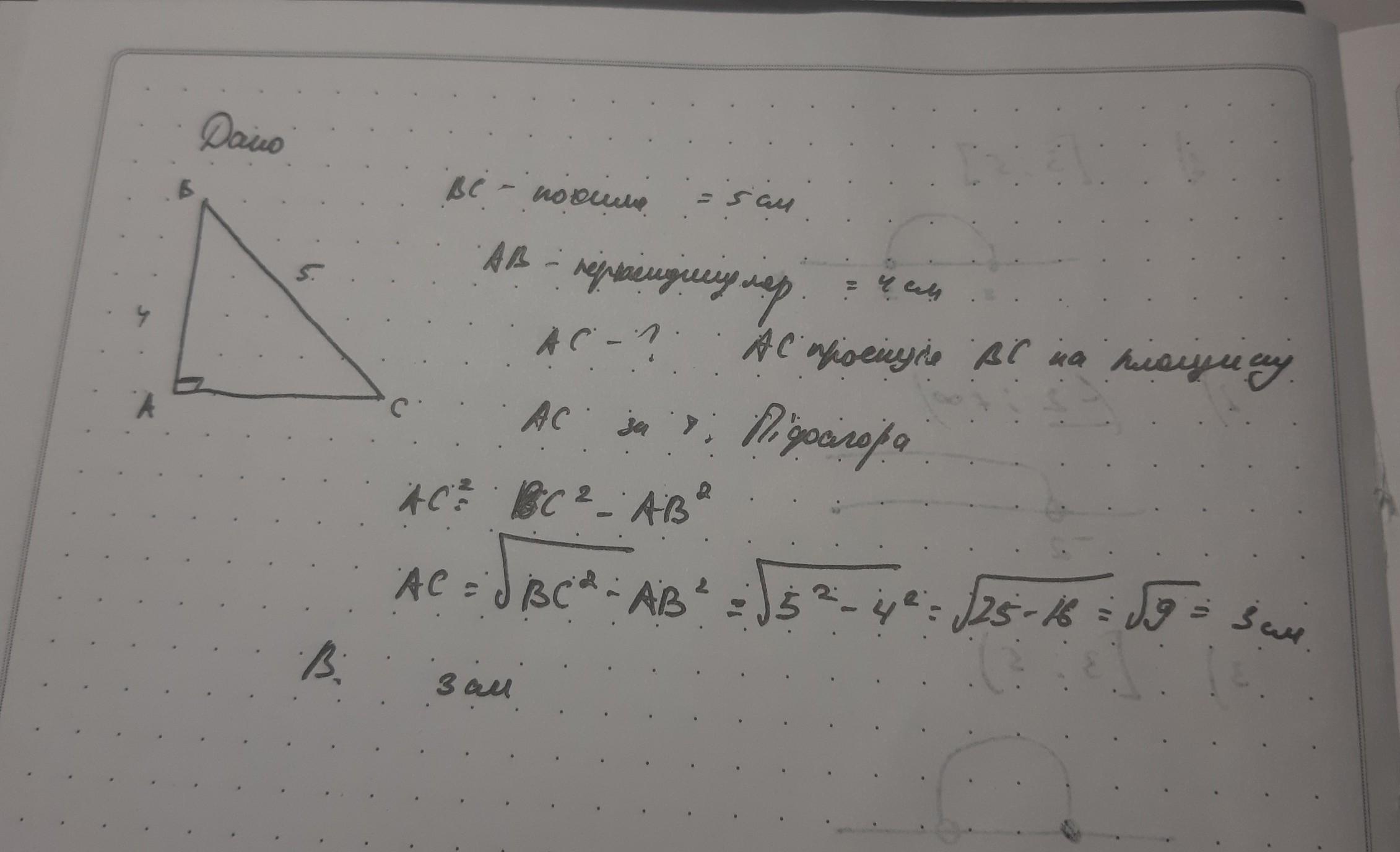 Знайдіть довжину проекції похилої, якщо відповідна похила дорівнює 5 см, а перпендикуляр, проведений з однієї з нею точки - 4 см