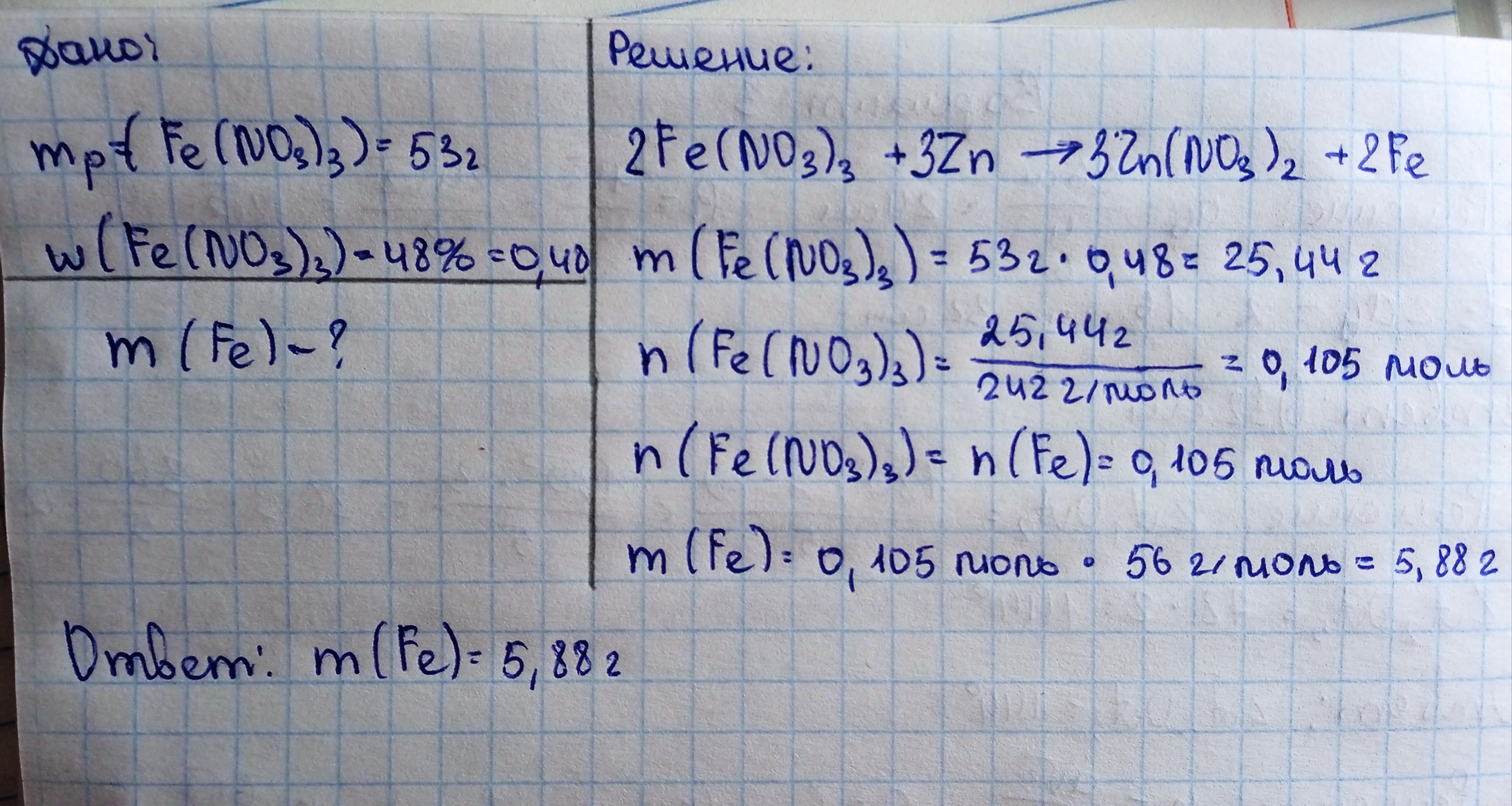 какая масса железа образуется при взаимодействии цинка с 53г 48%-ого раствора нитрата железа (3)?