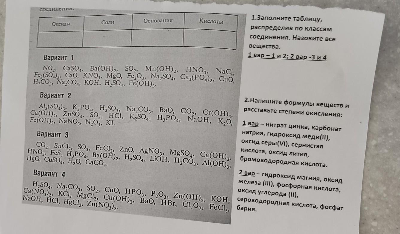 Оксиды- ZnO - оксид цинка, SO3- оксид серы(VI), CO2- оксид углерода(II), HgO-оксид ртути(||), H2O- оксид водорода