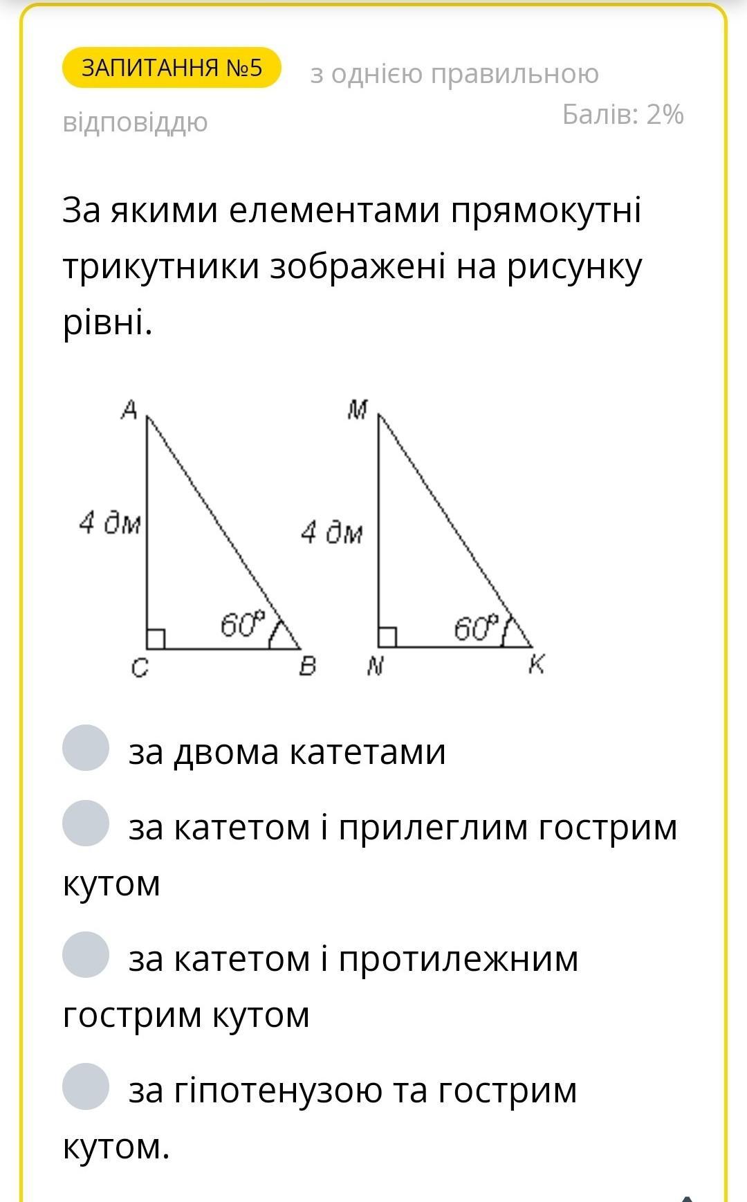 Треуголники равны по стороне (АС=МN) и прилежащим к ней углам 90 и 30 градусов (по 2-му признаку равенства треугольников)