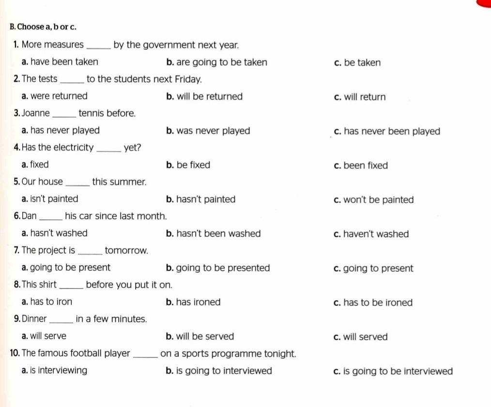 10) The famous football player c) is going to be interwieved on a sports programme tonight.