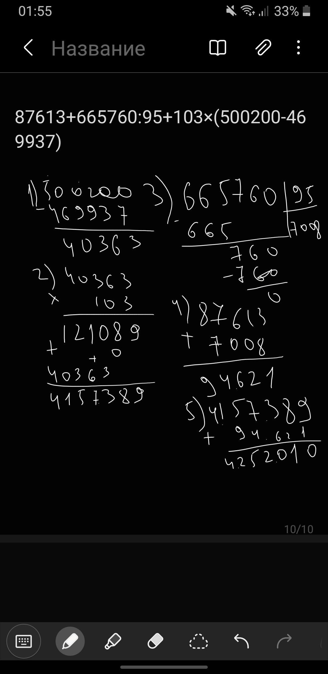 Решите пример 87613+665760:95+103×(500200-469937) с порядком действий Пошагово