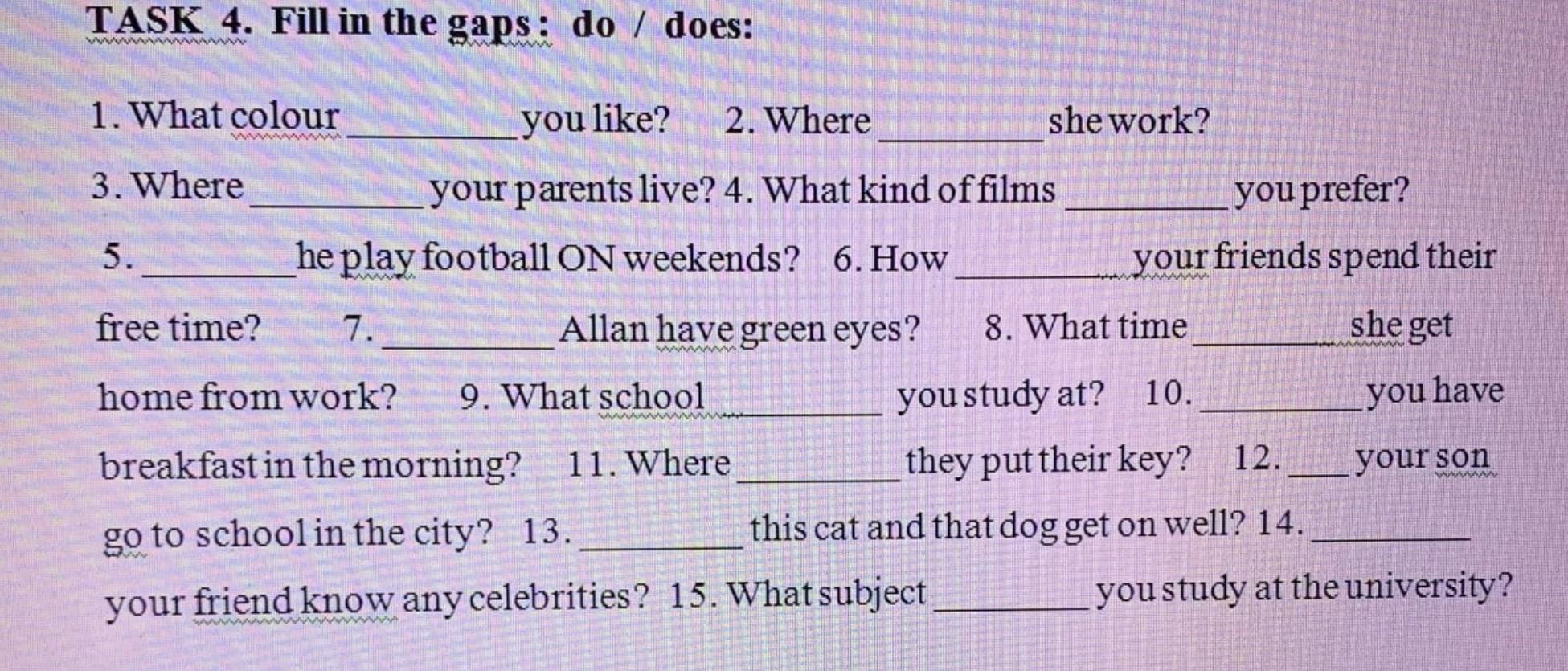1.Do 2.Does 3.Do 4.Do 5.Does 6.Do 7.Does 8.Does 9.Do 10.Do 11.Does 12.Do 13.Does 14.Do 15.Do