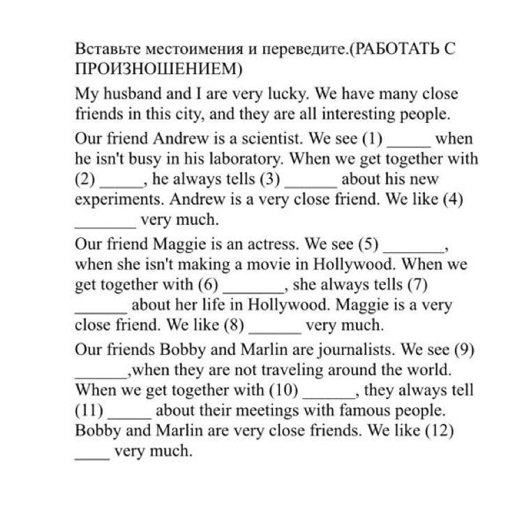 1. him; 2. him; 3. us; 4. him; 5. her; 6. her; 7. us; 8. her; 9. them; 10. them; 11. us; 12. them.